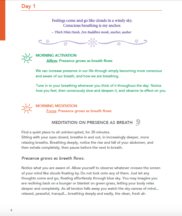 This journal is a writable PDF where you can make electronic notes, or else print it out and write on it. Each meditation has an invocative concept for the day’s meditation and a focus, that includes a journaling prompt for morning and evening, to help you get your reflective ideative thoughts flowing.