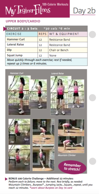 My Trainer Fitness 100 Calorie Workouts provide a 100+ calorie workout on each of six cards, that can be performed in under 20 minutes. The MTF100 workouts are designed to facilitate a 100+ calorie burn with each workout, including periods for rest and recovery.